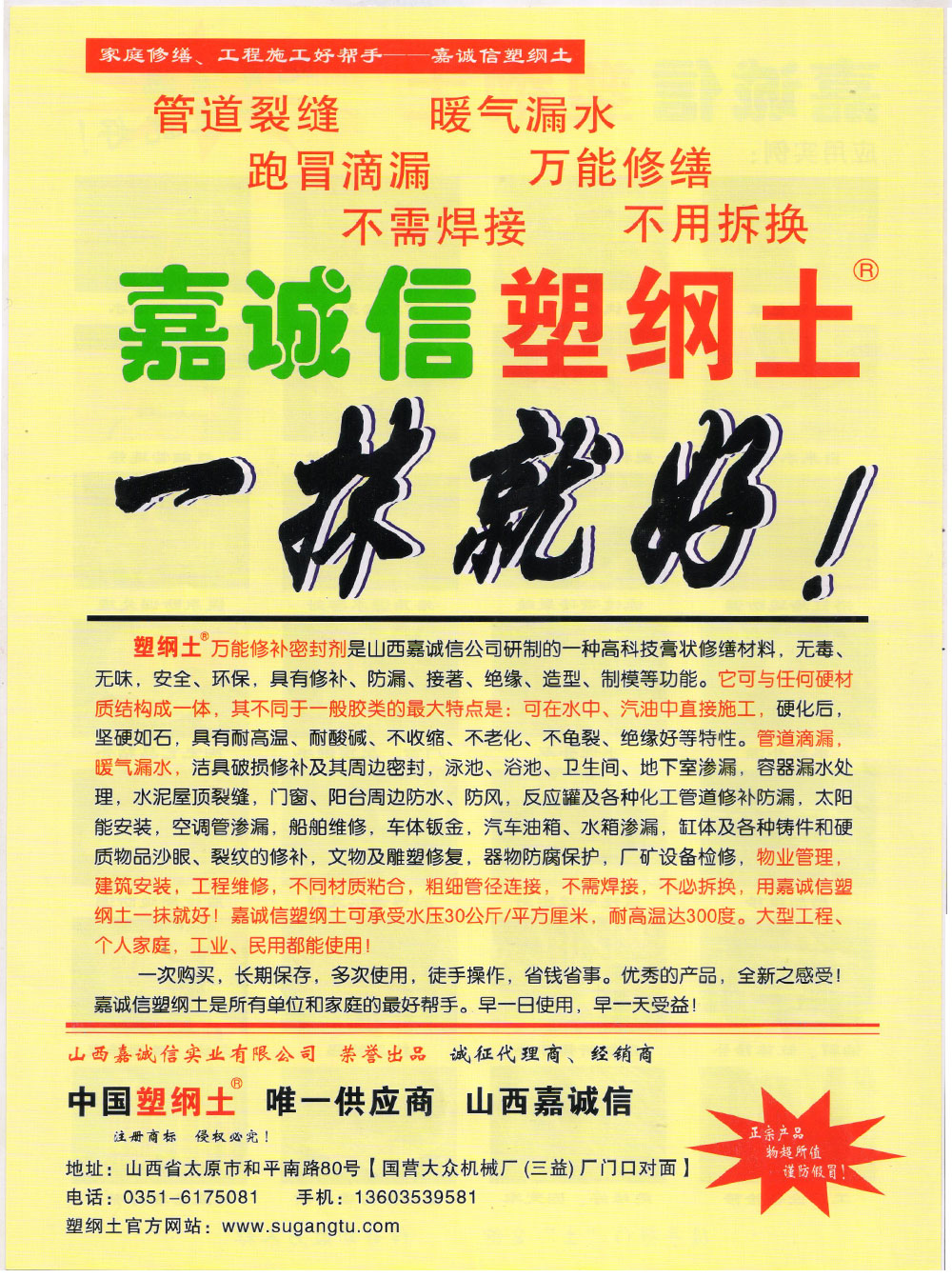 山西嘉誠信實業(yè)有限公司多年來一直致力于塑鋼土的研究、開發(fā),為塑鋼土在我國的推廣、應(yīng)用與普及立下了汗馬功勞!嘉誠信早已成了塑鋼土的代名詞,嘉誠信就是塑鋼土,塑鋼土就是嘉誠信。跑冒滴漏滲就找嘉誠信,要買塑鋼土還找嘉誠信,已成為廣大用戶的共識!